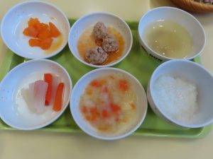 質問コーナーもひと段落し、今日の保育所の献立と取り分けた離乳食を紹介します!