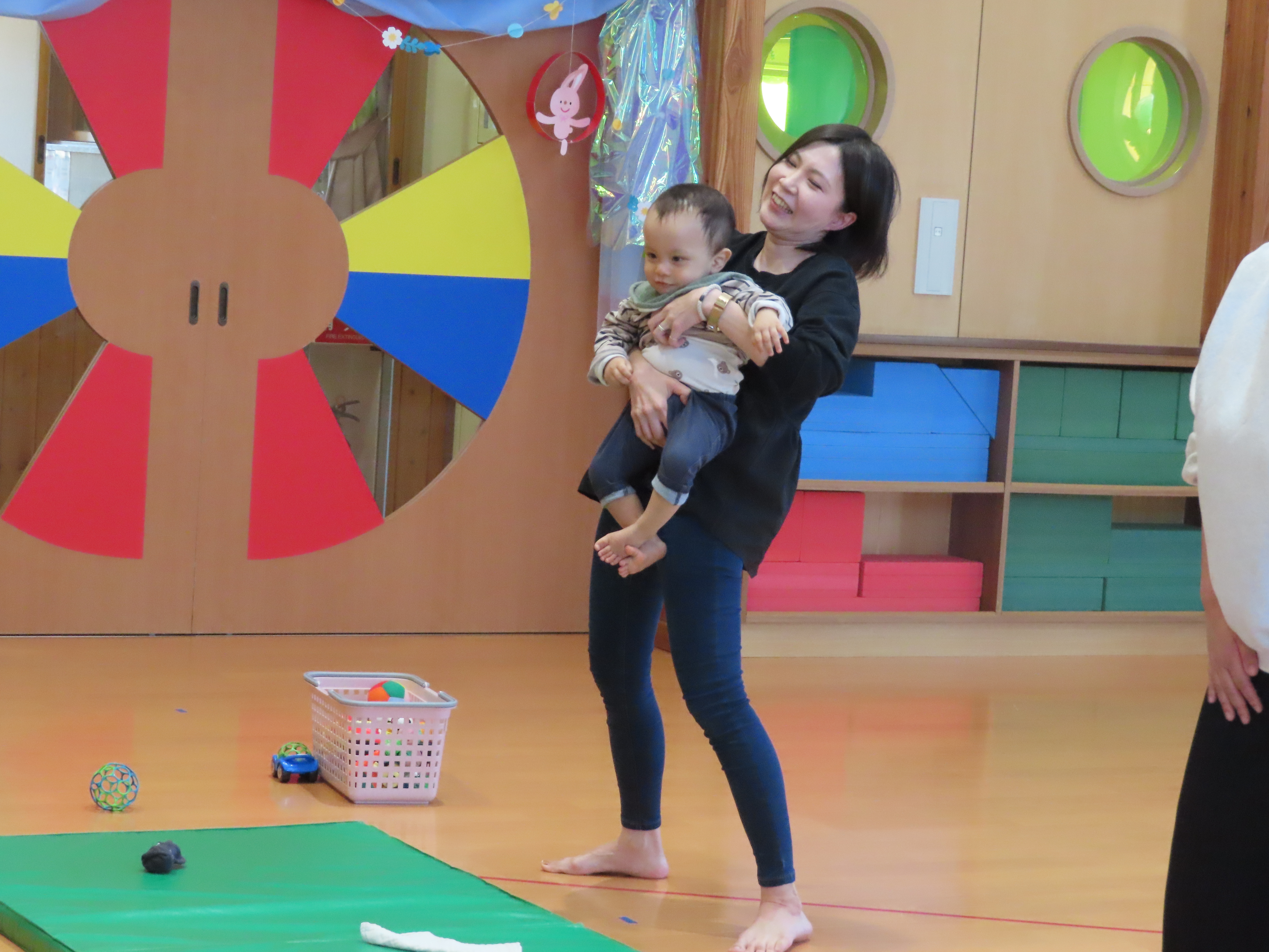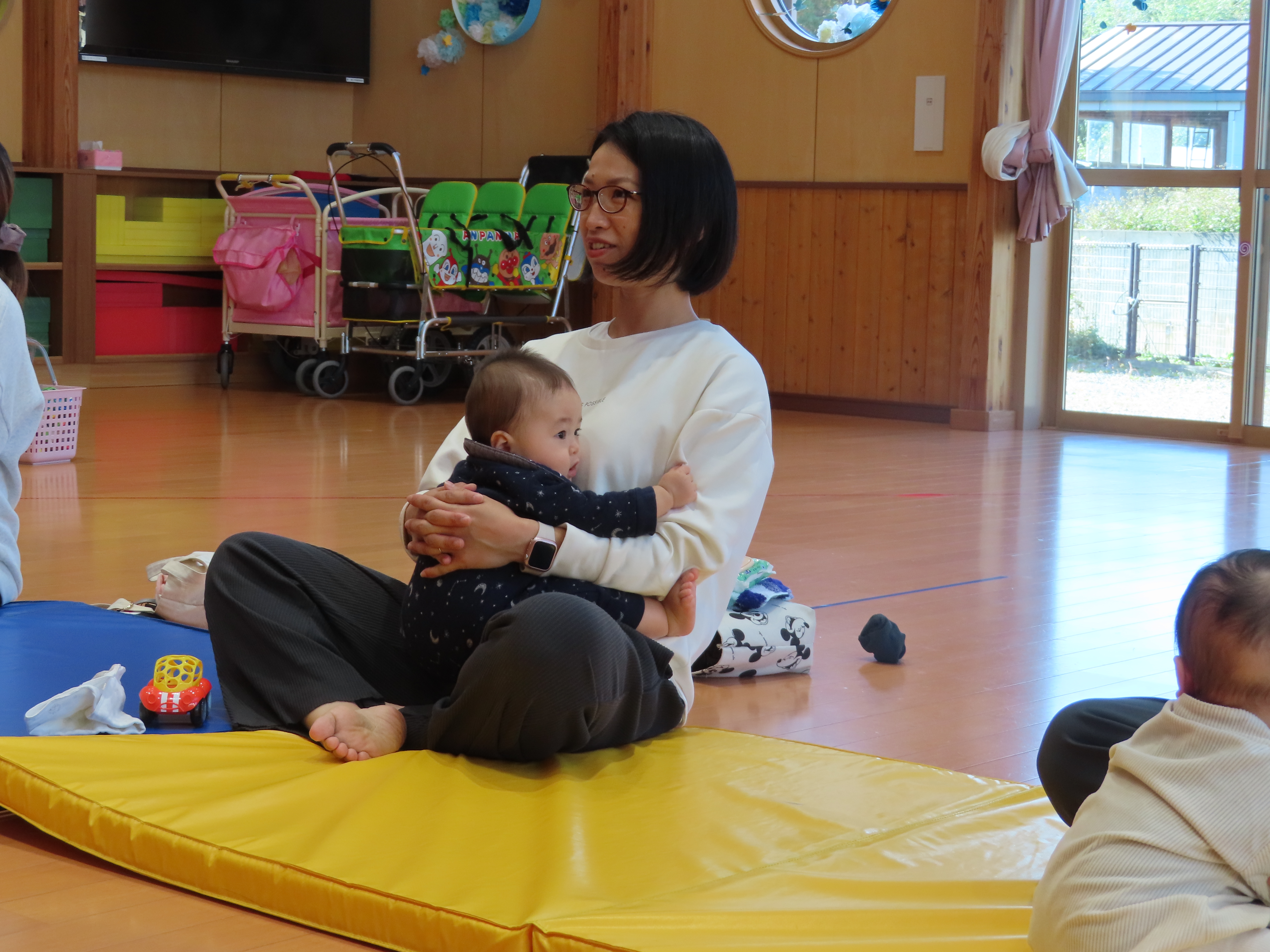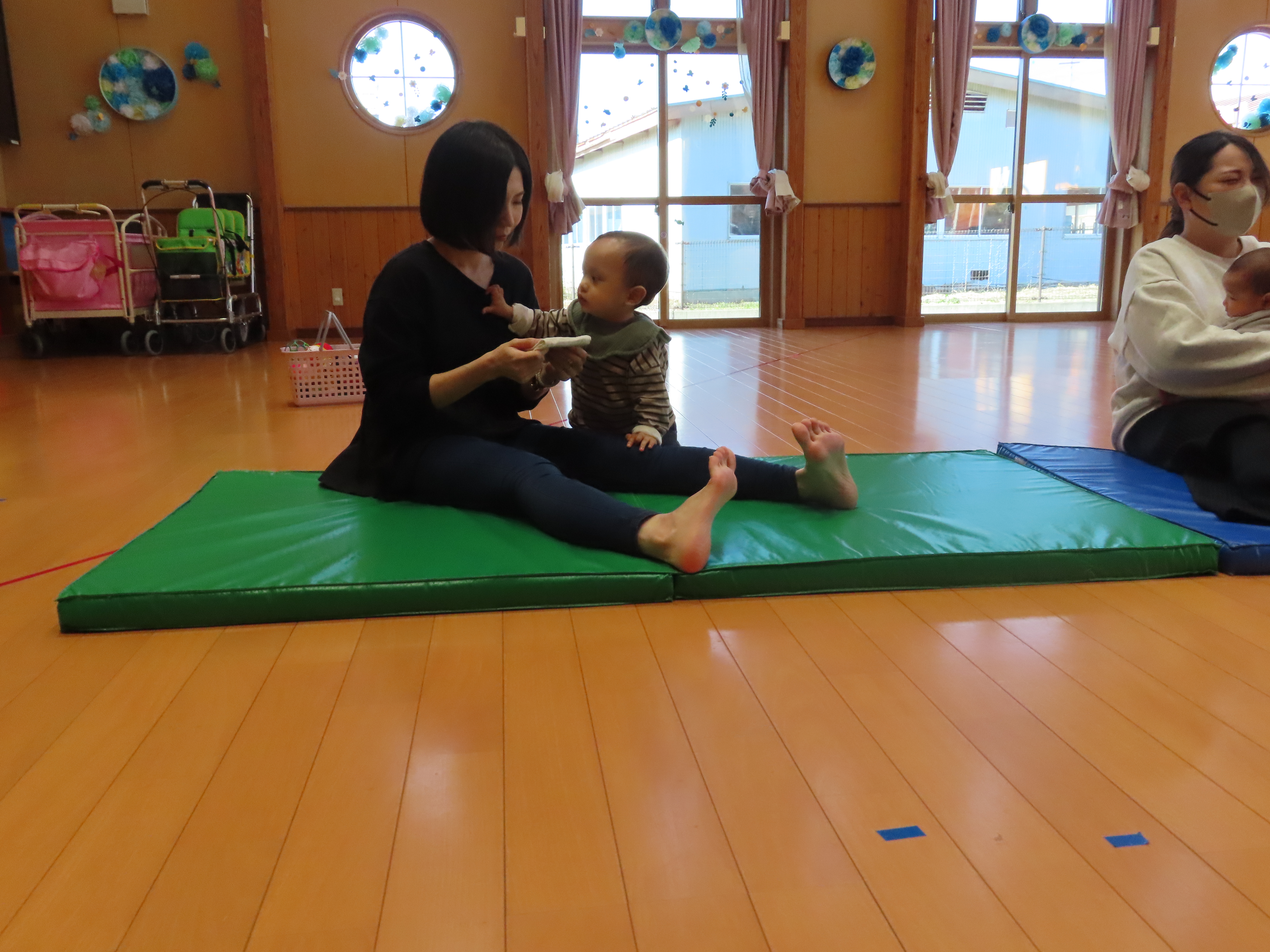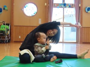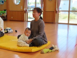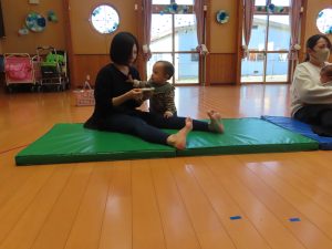 また、お母さんの出番です!今度は足の指をグーパー開いて閉じて…を繰り返しました。歳の数だけやればいいですよ~と講師の先生。