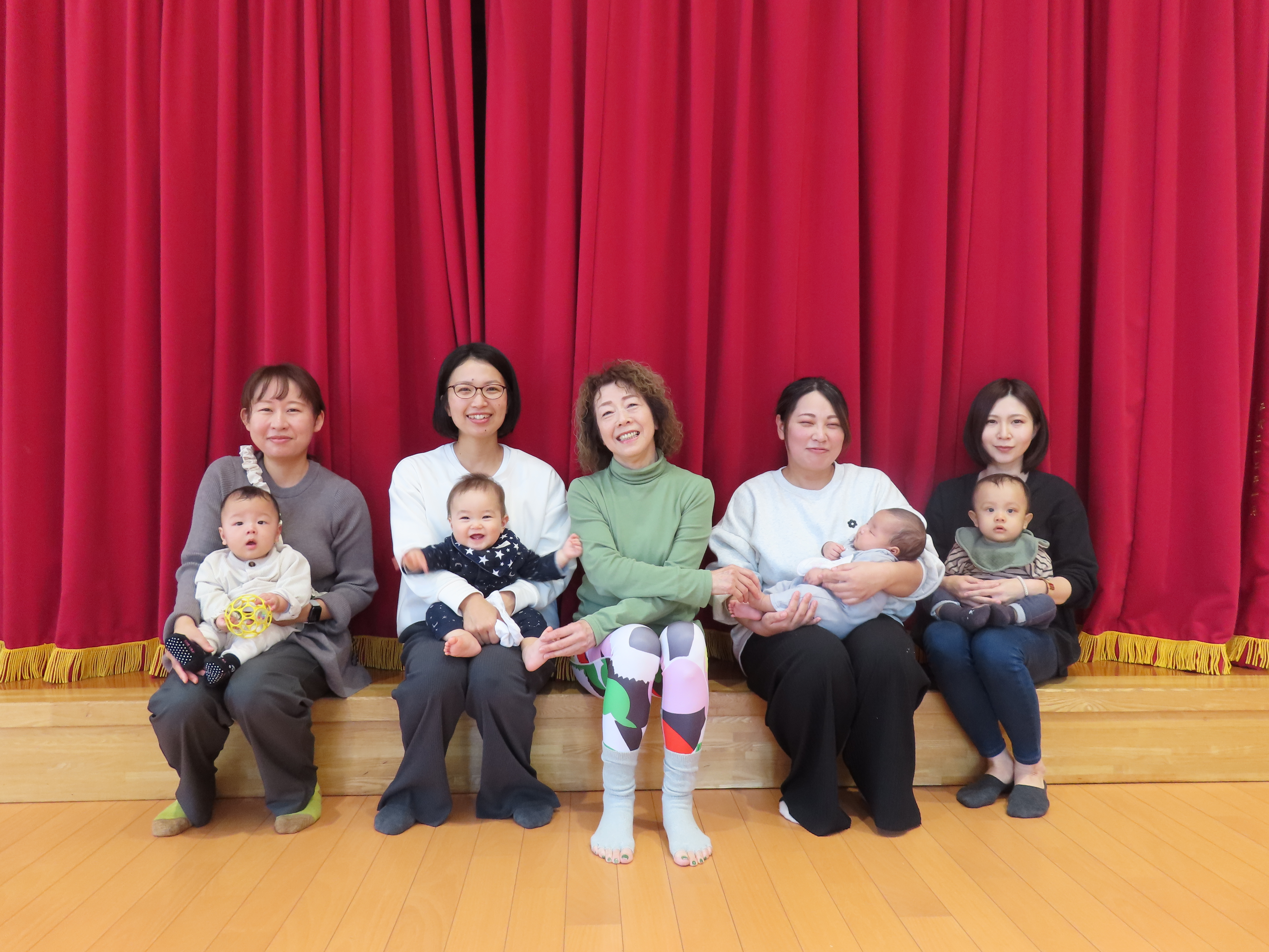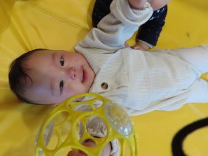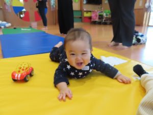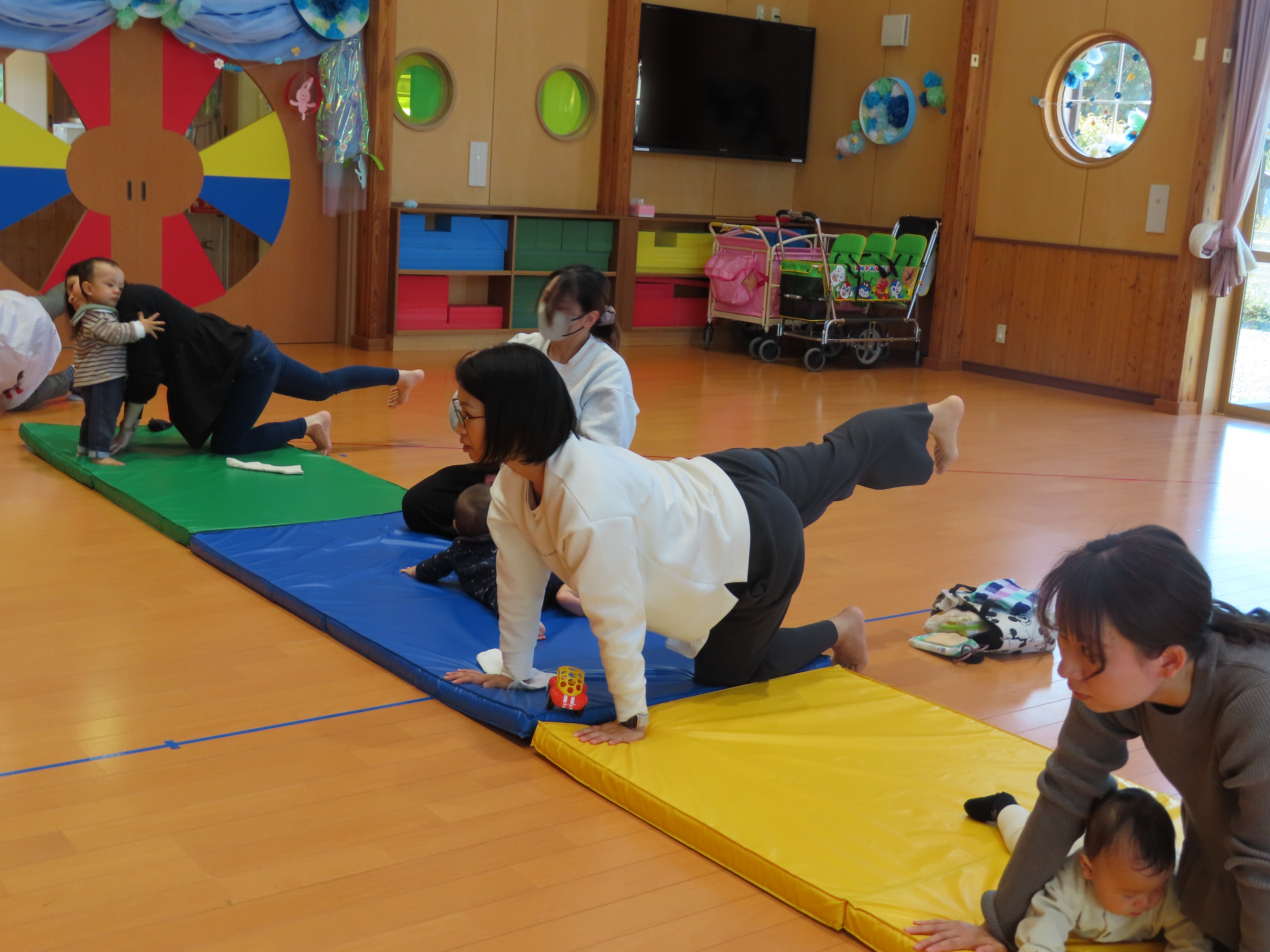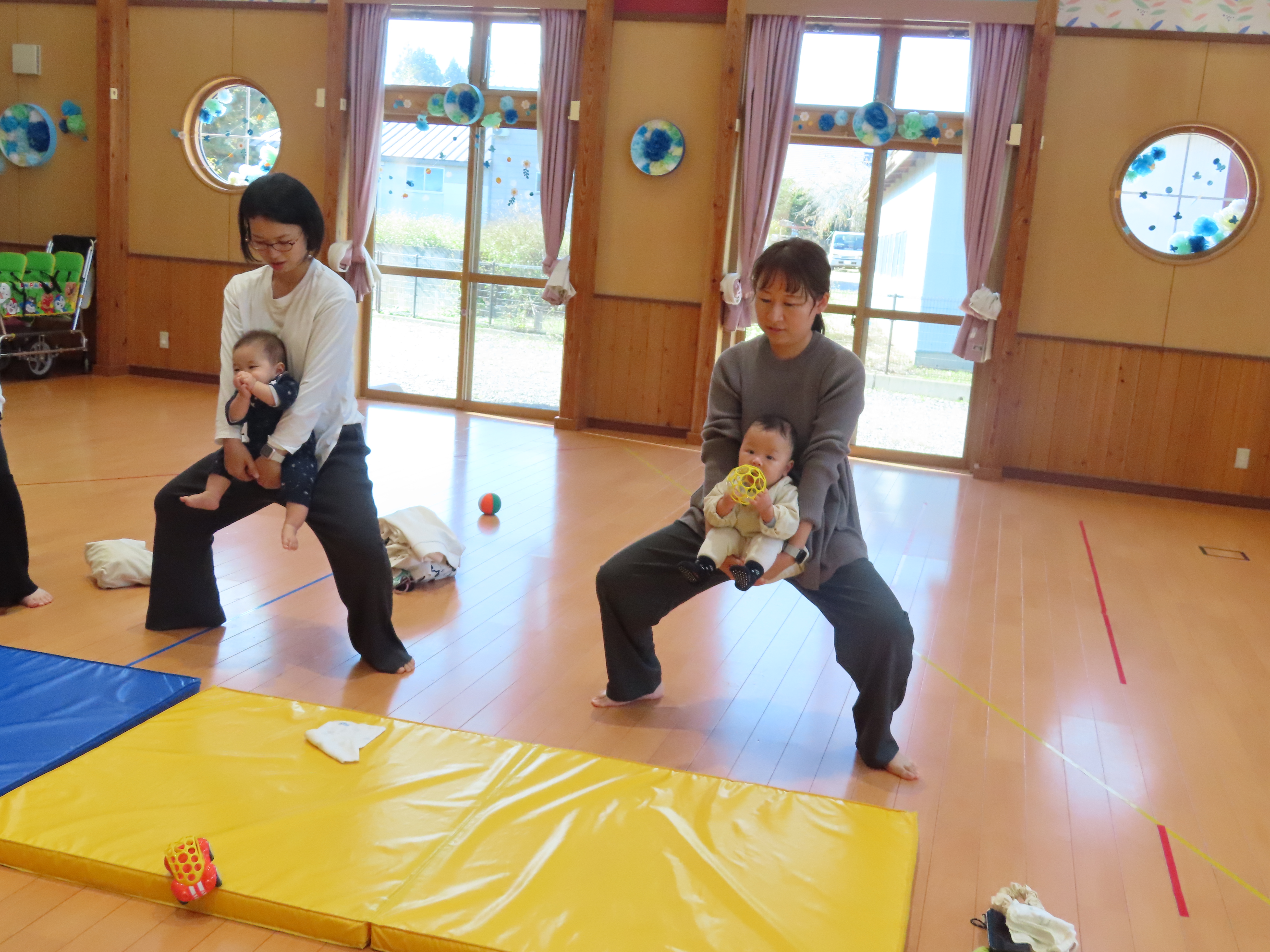 また、お母さんの出番です!今度は足の指をグーパー開いて閉じて…を繰り返しました。歳の数だけやればいいですよ~と講師の先生。