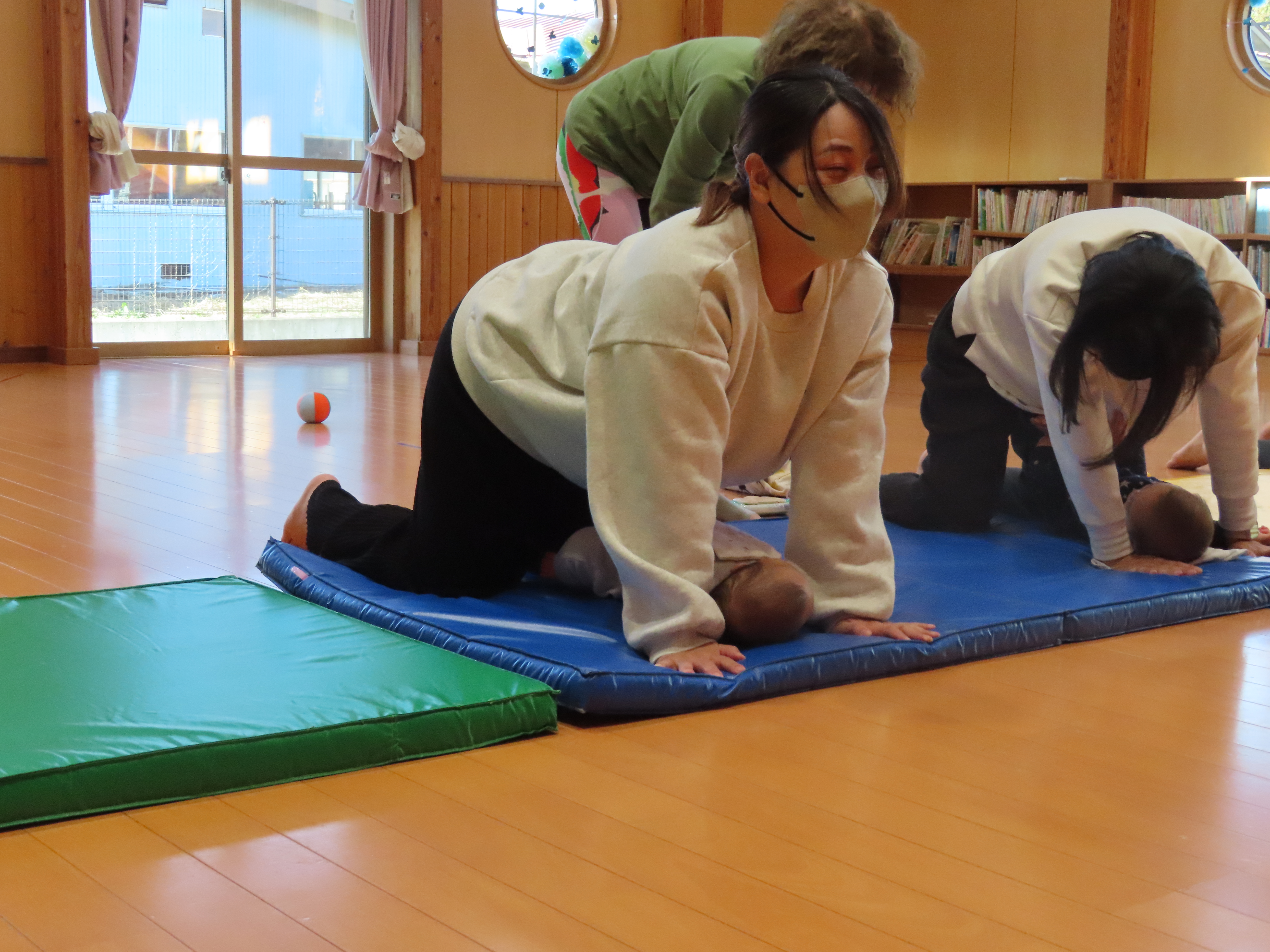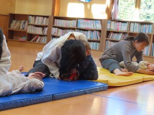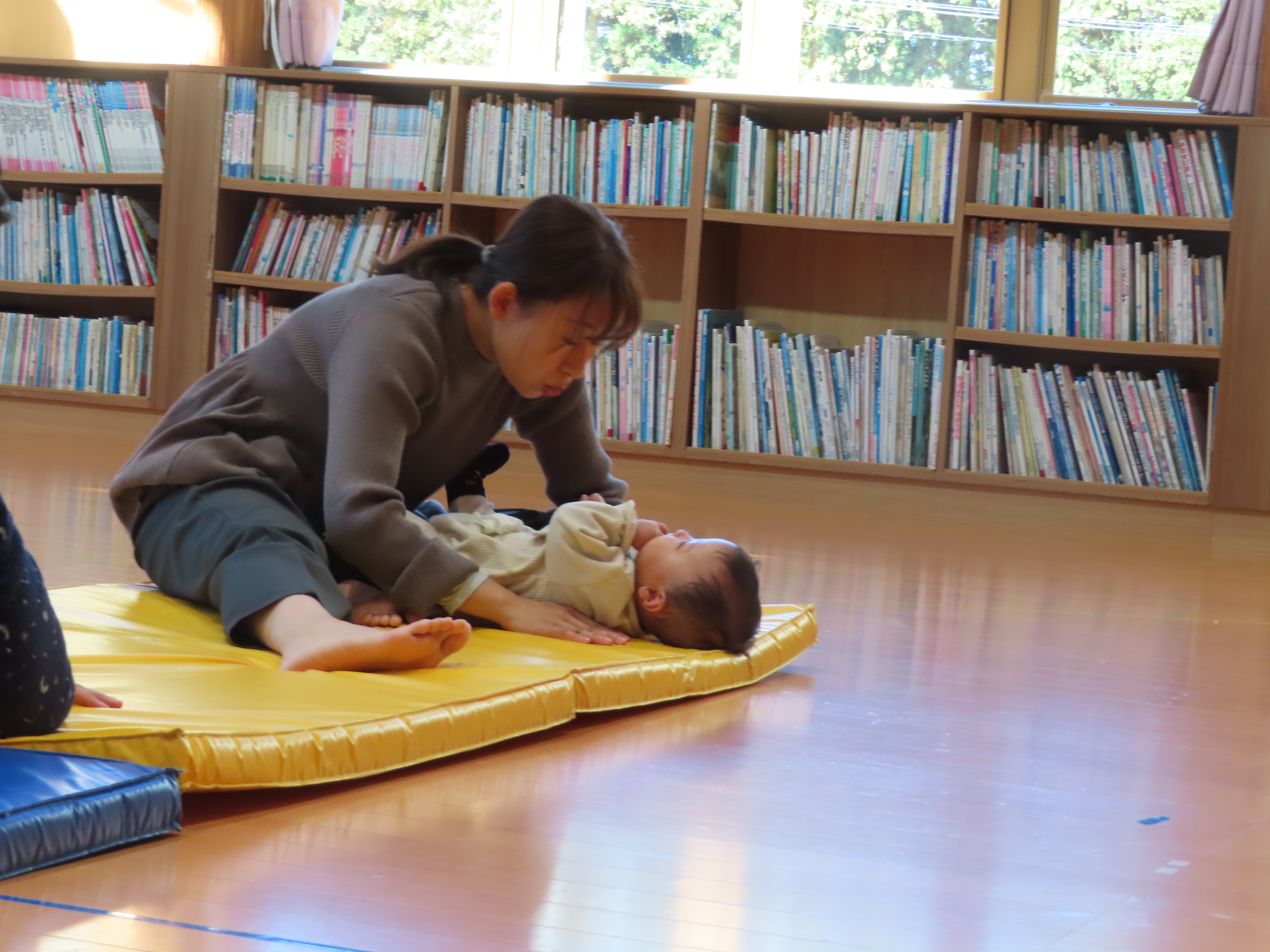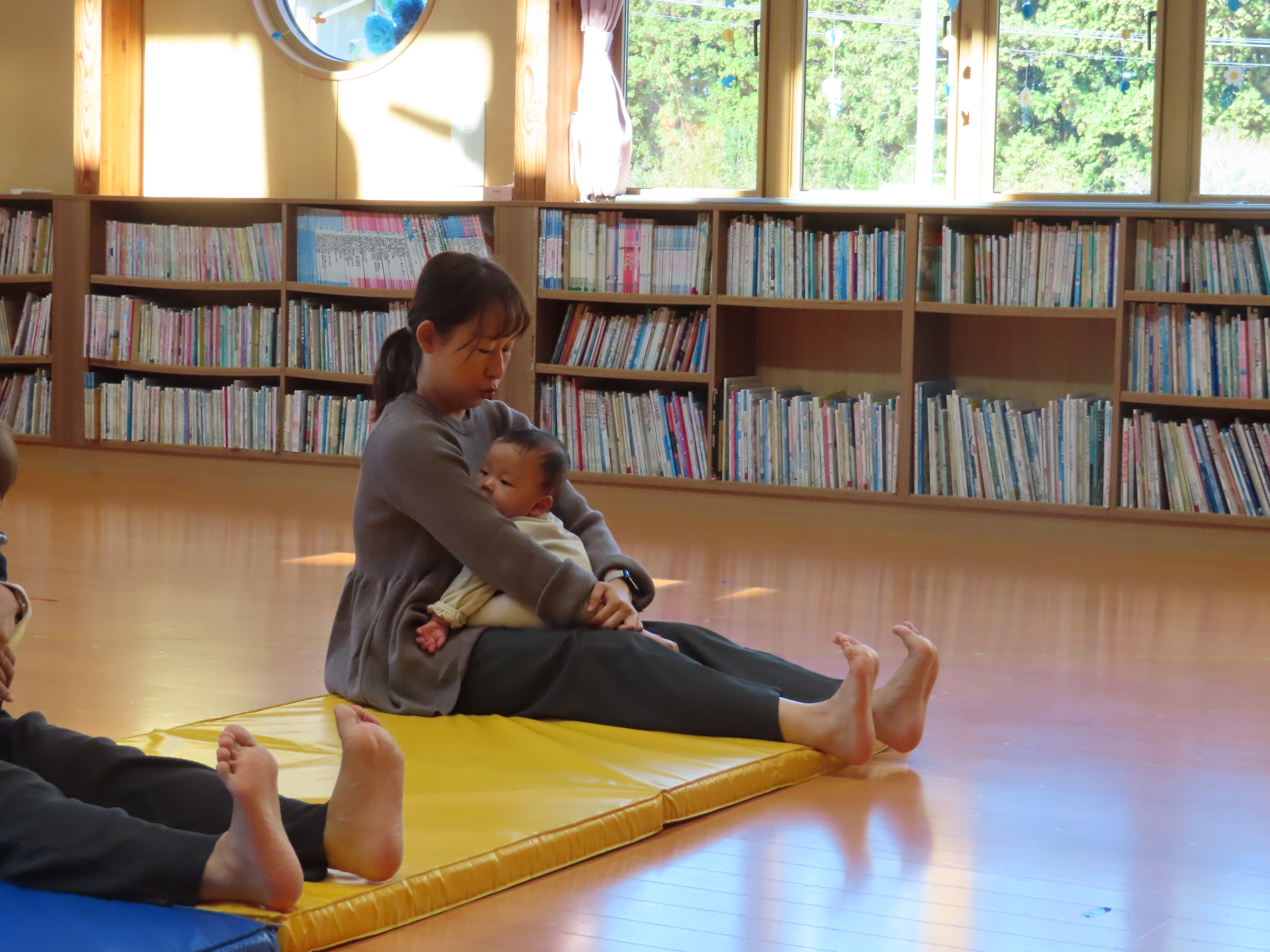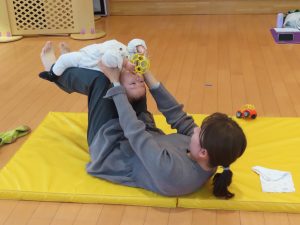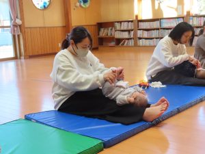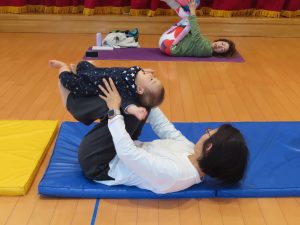 次は子どもも参加しました☺マットに寝かせ、足を前・後ろへ動かしたり、股関節をグルグル回しました。